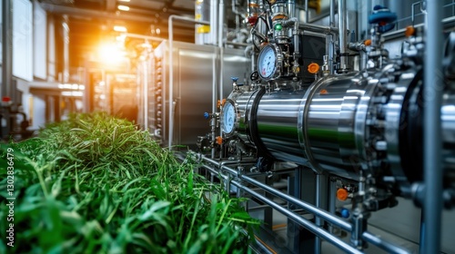 A modern industrial setting showcases sleek machinery surrounded by vibrant greenery, highlighting the intersection of technology and nature in innovative processing.
