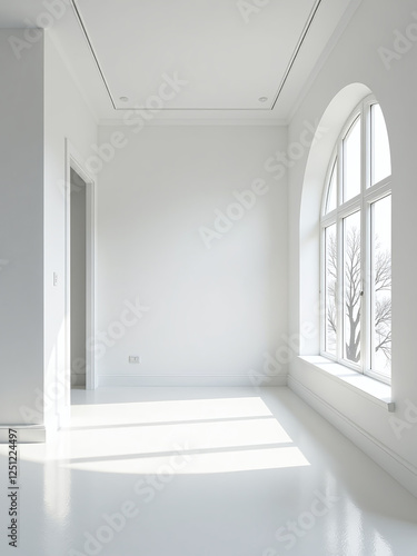 A Modern Interior Design Features A Big Rounded Window, Empty Space, And A Simple White Color Scheme With Natural Sunlight. 00002