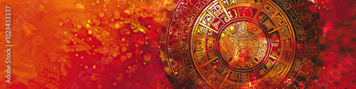 A modern interpretation of a traditional Aztec calendar, featuring vivid hues of red, orange, and gold against a minimalist, abstract background.
