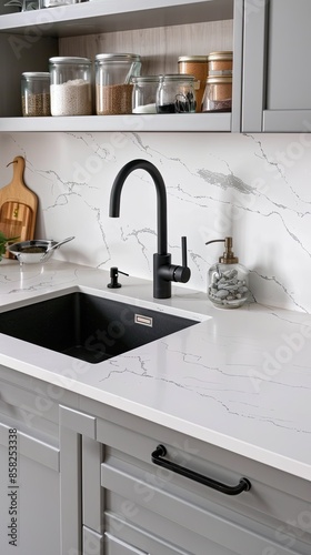 a modern kitchen interior featuring gray cabinets, a marble countertop, and a black sink, with a wall shelf decorated with jars of spices and decor accessories.