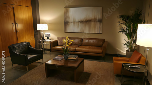 lounge, sofa, chair, table, plant, decor, lighting, modern, design, comfort, relaxation, warmth, space, furniture, aesthetic, home, interior, ambience, style, arrangement, colours, texture, seating, artistic, contemporary, cosy, inviting, minimalism, elegance, atmosphere, reception, hospitality, living, environment, leisure, urban, chic, tranquil, professional, workspace, office