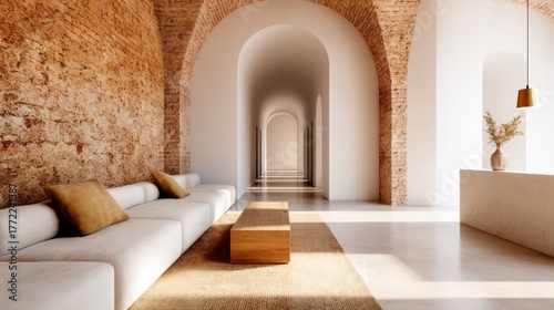 A modern, minimalist interior featuring arched walls, a light color palette, and natural textures, creating a serene and inviting atmosphere.