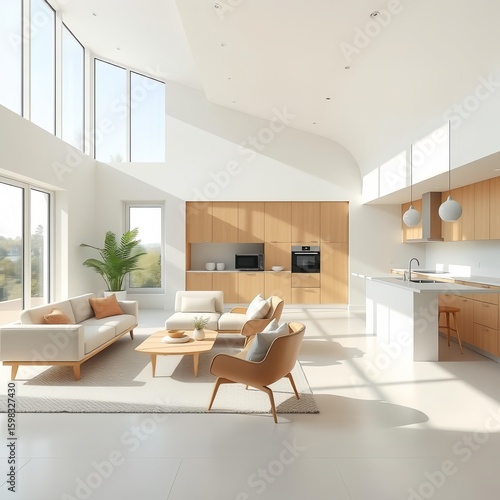 A modern minimalist living room and kitchen with natural light from large windows. The interior design features light wood furniture, a cream sofa, and simple decorative accents that create a warm at