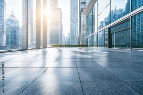 A modern office building entrance with a glass curtain wall and concrete floor, a city landscape background