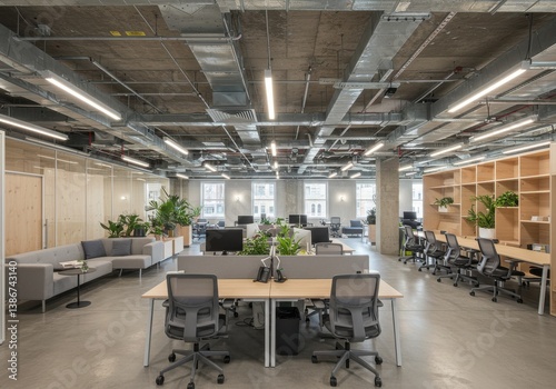 office, space, desk, chair, plant, ceiling, light, window, floor, room, furniture, computer, table, sofa, grey, modern, interior, design, shelf, wood, concrete, tile, wall, grid, empty, corporate, work, business, cubicle, open