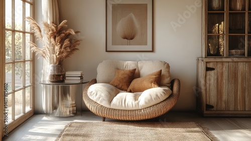 a modern reading nook with a woven chair a sleek glass console and a minimalist framed artwork earthy tones and soft textiles add warmth and character,stock image