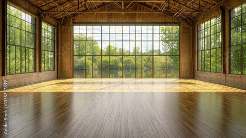 A modern room with large windows offering a panoramic view, featuring sleek hardwood floors and a spacious, airy design.