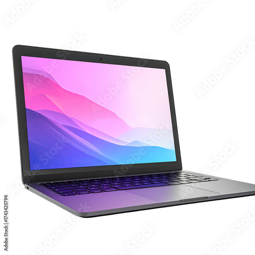 computer, technology, laptop, digital, device, screen, display, open, keyboard, silver, grey, black, background, colourful, abstract, wave, pink, purple, blue, light, modern, sleek, angle, design, workspace, office, work, study, education, online, cyberspace, connection, communication, productivity, portable, hardware, machine, contraption, computing, innovation, contemporary, efficient, minimal, style, aesthetic, bright, clarity, isolated