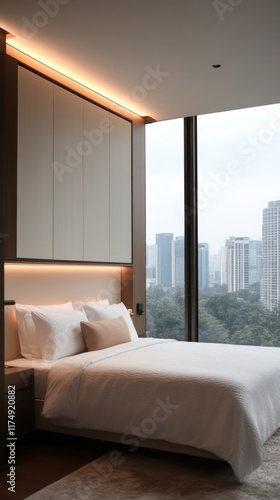modern, bedchamber, minimalist, interior, urban living, elegant, luxury, cosy, natural light, stylish, upscale, tranquil, sophisticated, chic, home automation, urban, comfort, inviting, plush, aesthetic, technology, window, architecture, interior design, futuristic, space saving, innovation, elevated, lifestyle, serene, vertical