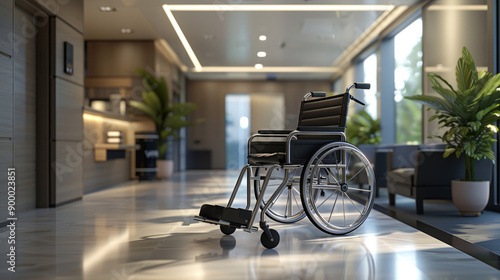 A modern, spacious corridor featuring a stylish wheelchair and lush greenery, conveying accessibility and comfort in a healthcare setting.