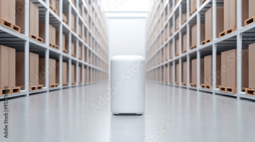 A modern storage facility with neatly arranged boxes and a central white object, symbolizing organization and efficiency in logistics.