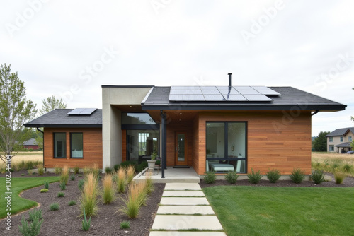 A Modern Sustainable house with sleek solar panels integrated into a flat roof, framed by minimalist landscaping.