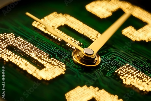 clock, time, technology, circuit, board, green, gold, analog, detail, closeup, futuristic, concept, network, digital, design, abstract, precision, modern, mechanical, hand, face, dial, hours, minute, second, electronic, background, macro, structure, surface, pattern, illuminated, bright, round, shiny, metal, hardware, component, dot, gold, accurate, timing, progress, device, contraption, future, speed, elegant