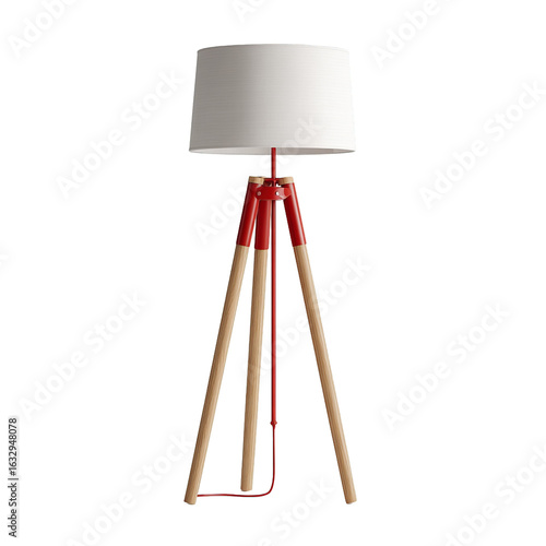 A modern tripod floor lamp featuring a white shade and red details, with wooden legs, suitable for home interior lighting.