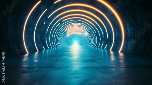 A modern tunnel illuminated by vibrant neon lights, creating an intriguing perspective. The light at the end adds a sense of mystery and depth.