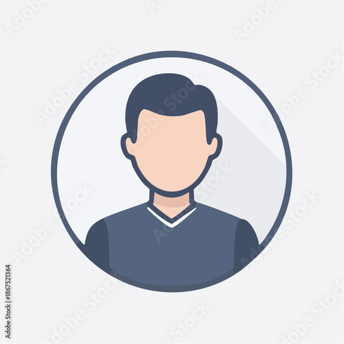 A modern vector icon of a man with short, dark hair and a dark blue v-neck t-shirt within a white circle with a shadow.