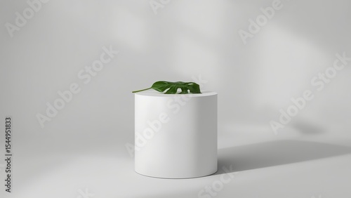 A modern white cylindrical pedestal with a green monstera leaf atop, set against a soft, neutral background.