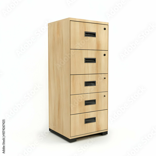 A modern wooden filing cabinet with five drawers, perfect for organizing office documents and supplies.