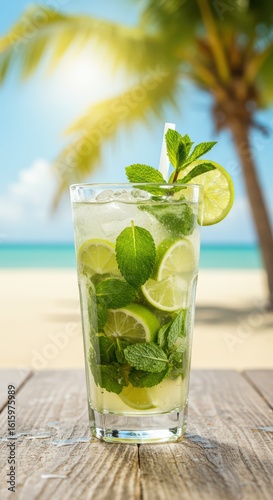 A mojito on a wooden table against a blurry beach background with palm trees. A refreshing summer cocktail with lime and mint for banners, posters or bar menus with copy space.