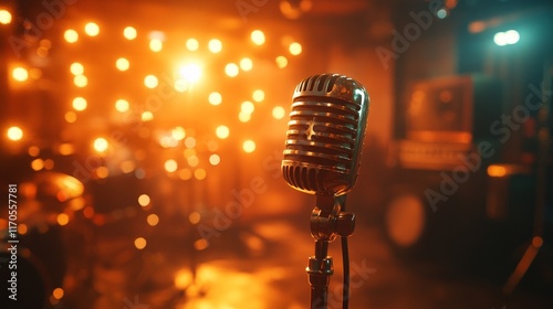 A moody recording studio setup with a microphone and warm lighting, perfect for podcasting or audio production.