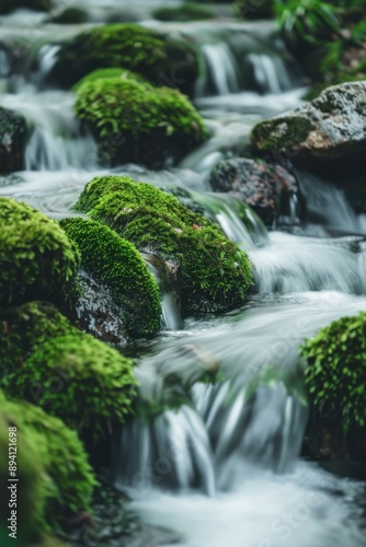A mossy stream flows over smooth rocks. AI.