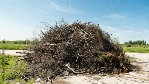 a mountain of dry branches against a blue sky