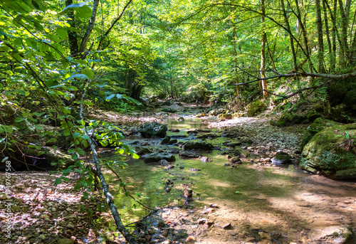 a mountain river with a calm flow and current in the warm season in nature and on a sunny day