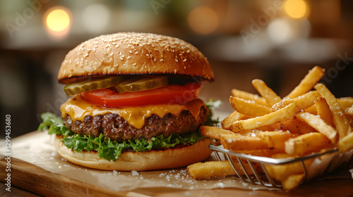 A mouth-watering cheeseburger with melted cheddar, fresh lettuce, tomato, and pickles on a sesame seed bun, served alongside crispy golden French fries