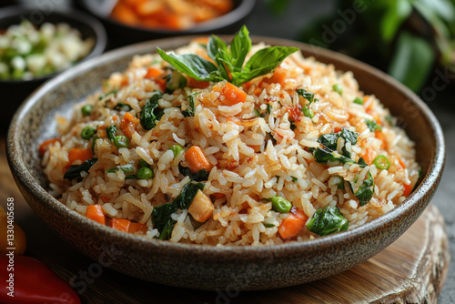 mouth-watering, dish, fried, rice, vegetable, herb, served, ceramic, bowl, crisp, gold, brown, ingredient, include, chopped, carrot, green, pea, spinach, onion, garnished, fresh, basil, leaf, adding, favor, brightness, composition, additional, spice, visible, background, creating, atmosphere, home, cooking, asian, eatery, sharpened, foreground, texture, richness, cookery, vegetarian, carrot, onion, receipe, gastronomy
