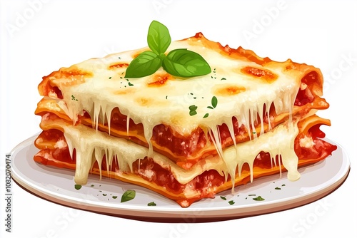 A mouthwatering plate of lasagna featuring layers of cheese and meat sauce, garnished with fresh basil for added flavor.