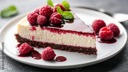 A mouthwatering slice of raspberry cheesecake garnished with fresh berries tempts dessert lovers, showcasing a delightful fusion of flavors and culinary art.