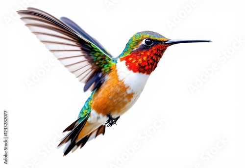 A multicolored hummingbird with vibrant plumage is captured in mid flight against a white backdrop, Generative AI