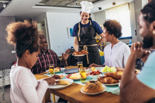 A multi-generational African-American family enjoying food at their dinner table. Caucasian woman cook serve them.