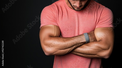 A muscular man stands with his arms crossed, showcasing strong biceps against a dark background, This image can be used for fitness, personal training, wellness, or motivational themes,