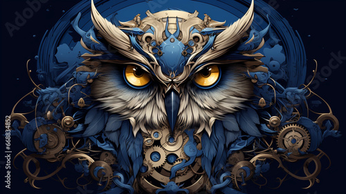 A mystical blue owl adorned with golden curls and shimmering iridescence, characterized by rounded patterns.