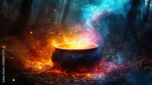 A mystical cauldron emits vibrant colors and swirling smoke in a magical forest setting, creating an enchanting atmosphere.
