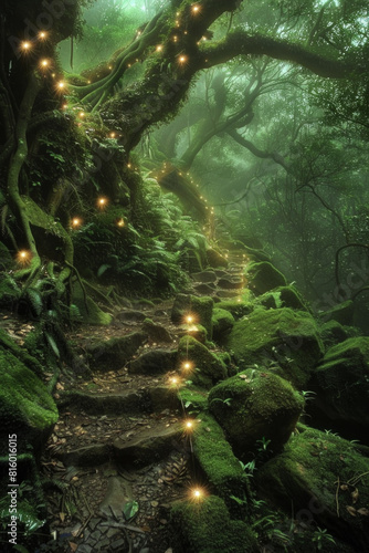 A mystical fairy tale forest illuminated by twinkling fairy lights, with moss-covered rocks, gnarled trees, and hidden glens.