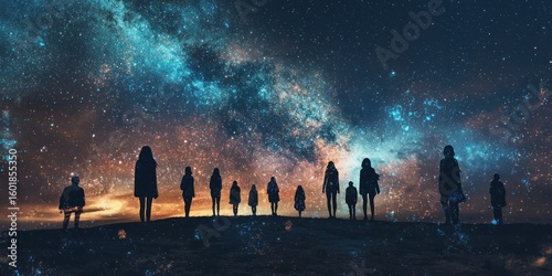 A mystical scene where a group of people have shimmering cosmic skin that reflects the Milky Way