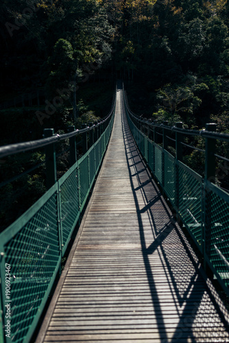 A narrow wooden suspension bridge spans over a lush green forest in the daylight. Yuli Township, Hualien County, Taiwan