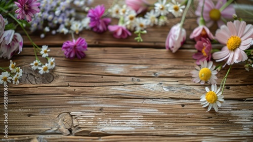 A natural empty wooden floor with natural flowers as a frame and soft sunlight shining through the background.