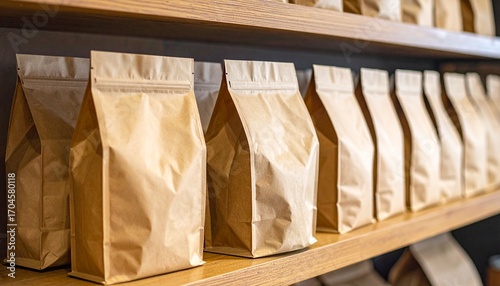 A neat row of sealed brown paper bags for coffee, tea, or other dry goods, showcased on a wooden store shelf