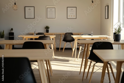 A neatly arranged coworking space featuring light wood tables, comfortable black chairs, and minimal decor elements under natural light