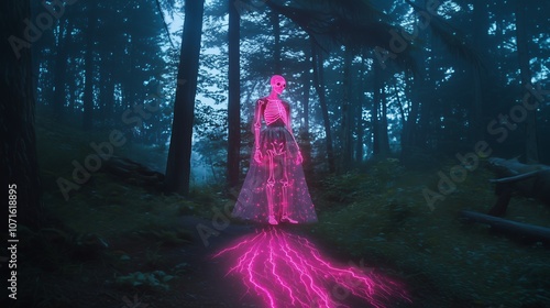 skeleton, neon, forest, night, glow, electric, eerie, mystical, skittish, surreal, wood, luminescent, pink, phantom, aethereal, haunting, darkness, path, fantasy, mysterious, ghostly, glowing, radiant, spectral, atmospheric, enchanted, holographic, dreamlike, uncanny, wilderness, fluorescent, foggy, enigmatic, illuminated, shadowy, forested, supernatural, magic