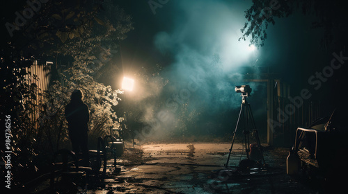 A night shoot on location with powerful spotlights illuminating the scene, casting long shadows and creating a dramatic contrast against the dark surroundings