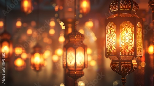 A nighttime scene features glowing lanterns hanging, with a softly lit building in the background for ramadan decoration