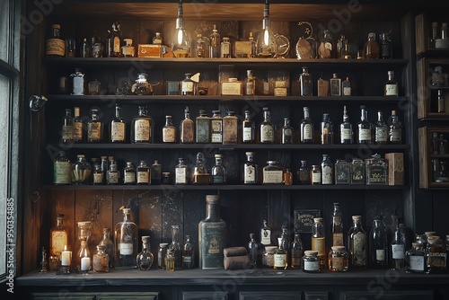 A nostalgic display of vintage glass bottles on a wooden shelf, perfect for enhancing interior decor with a classic touch.
