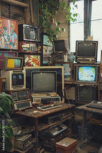 A nostalgic room filled with vintage televisions and computers, capturing the essence of retro technology with faded screens and old-school design.