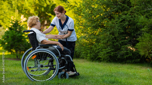 A nurse holds an elderly caucasian woman in a wheelchair by the hand as support. Nurse walks with a patient in the park.