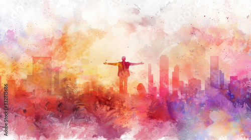 A painting depicting a person standing in front of a city skyline, capturing the contrast between the individual and the urban landscape