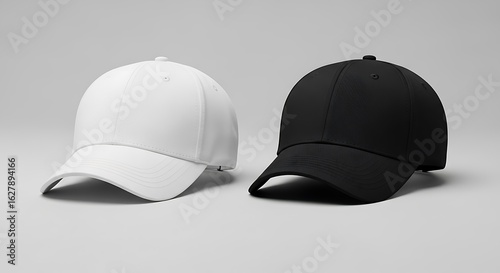 A pair of classic blank baseball caps, one white and one black, on a neutral grey background.